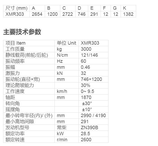 XMR303雙鋼輪振動壓路機是工作質量為3噸的輕型振動壓路機。該機適用于瀝青工程、水泥工程等表層壓實和路緣的壓實作業(yè),也適用于底基層和基層,沙土和礫石材料的壓實作業(yè),是各種停車場施工、車行道、人行道和自行車道壓實以及各種道路維修保養(yǎng)工程中最理想的壓實機械。其特點是小振幅、高頻率,自身攜帶刮泥和灑水裝置。該振動壓路機還可以斷開振動,替代靜碾壓路機進行路面平整壓實和填土層壓實。