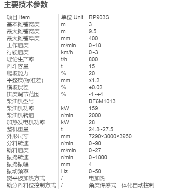 RP903S型瀝青混凝土攤鋪機(jī)是根據(jù)產(chǎn)品市場(chǎng)需求,以及我公司的攤鋪機(jī)現(xiàn)狀開發(fā)的一款9米高端大型攤鋪機(jī),是與德國(guó)VOGELE S2100-3、S1880-3為同一技術(shù)檔次產(chǎn)品,在部分技術(shù)上還處于領(lǐng)先的地位,主要適用于攤鋪瀝青混泥土面層施工,其****攤鋪寬度可達(dá)9.5米,是高等級(jí)公路建設(shè)中重要的施工設(shè)備。