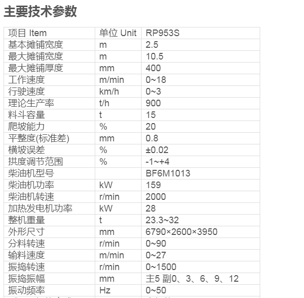 RP953S型瀝青混凝土攤鋪機(jī)是根據(jù)市場(chǎng)需求而決定開發(fā)的一種大型攤鋪機(jī),與目前國(guó)際******的德國(guó)VOGELE S1880-3為同一技術(shù)檔次產(chǎn)品,在部分技術(shù)上處于領(lǐng)先地位,該產(chǎn)品主要適用于攤鋪瀝青混凝土面層,也可攤鋪二灰土、二灰碎石等基層材料,其****攤鋪寬度可達(dá)10.5米,是高等級(jí)公路建設(shè)中重要的施工設(shè)備。